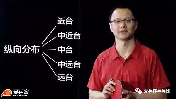 我们以正手位为例来做示范,大概离球台50公分左右,是近台,再往后退个20-30公分,就是中近台,离球台一米左右,是中台,再往后个半米就是中远台、远台了。